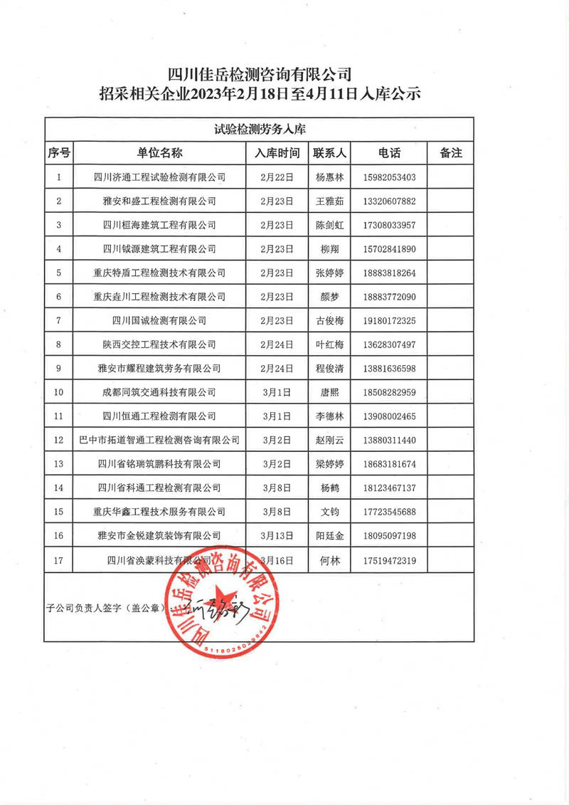 四川佳岳檢測(cè)咨詢有限公司(試驗(yàn)檢測(cè)勞務(wù)供應(yīng)商庫)2023年2月18日至4月11日入庫結(jié)果公示