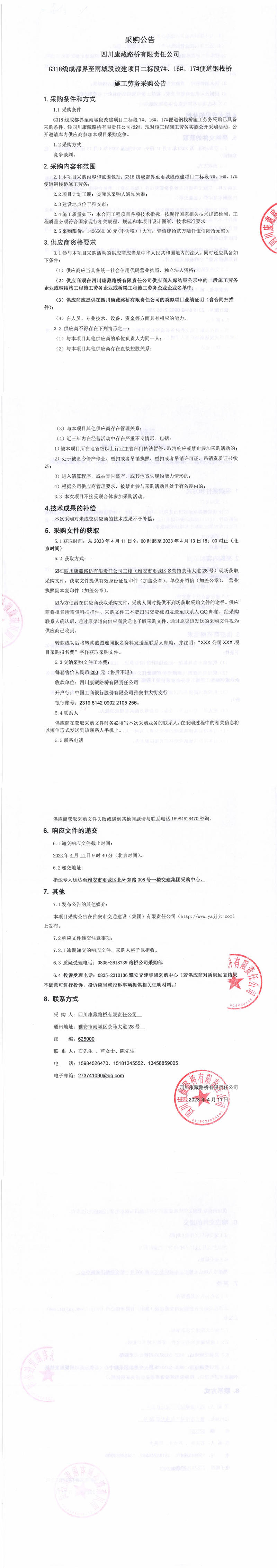 四川康藏路橋有限責(zé)任公司G318線成都界至雨城段改建項目二標(biāo)段7#、16#、17#便道鋼棧橋施工勞務(wù)采購公告