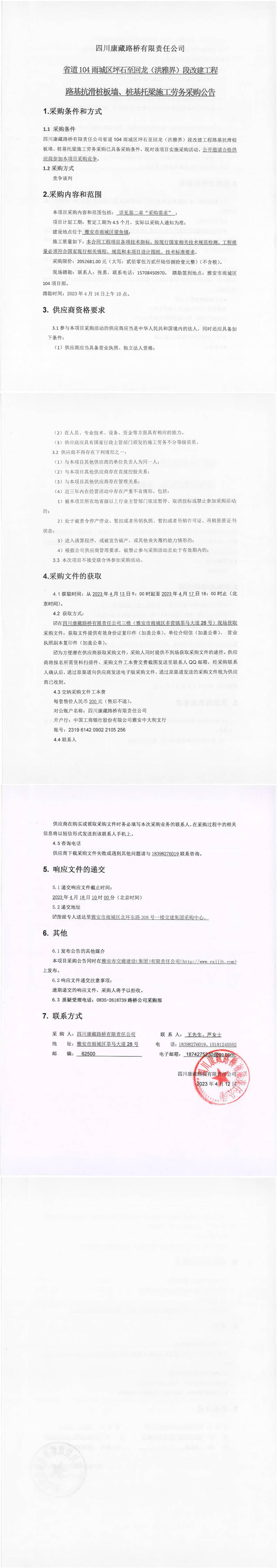 四川康藏路橋有限責(zé)任公司省道104雨城區(qū)坪石至回龍(洪雅界)段改建工程路基抗滑樁板墻、樁基托梁施工勞務(wù)采購(gòu)公告
