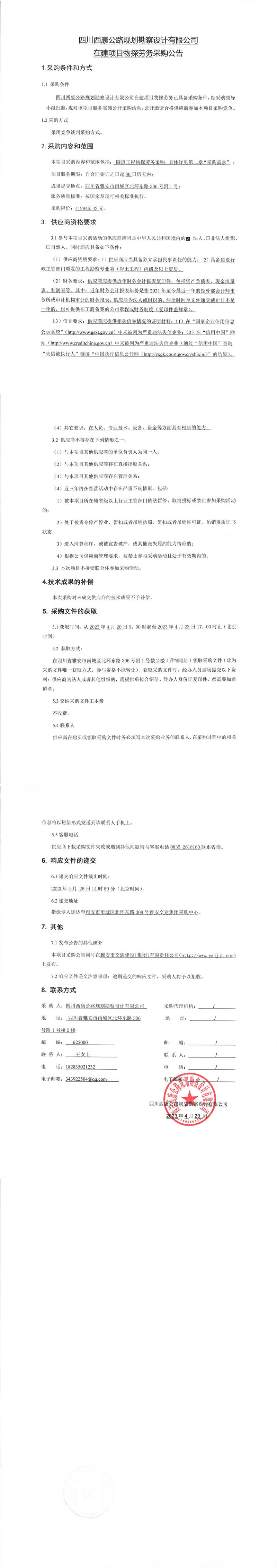 四川西康公路規(guī)劃勘察設(shè)計有限公司在建項(xiàng)目物探勞務(wù)采購公告