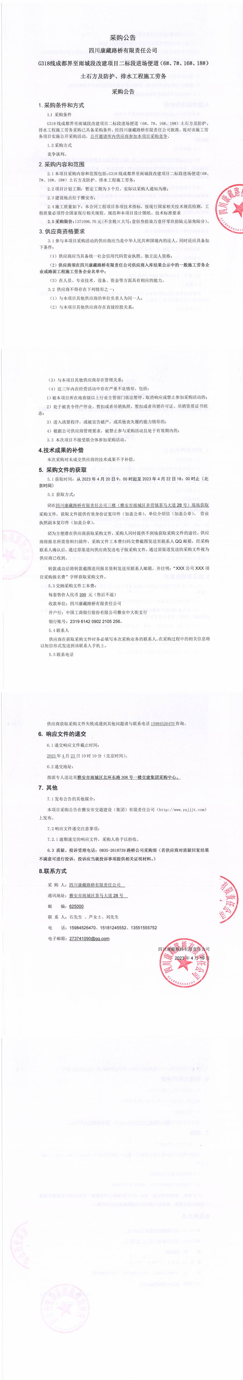 四川康藏路橋有限責任公司G318線成都至雨城段改建項目二標段進場便道(6#、7#、16#、18#)土石方及防護、排水工程施工勞務