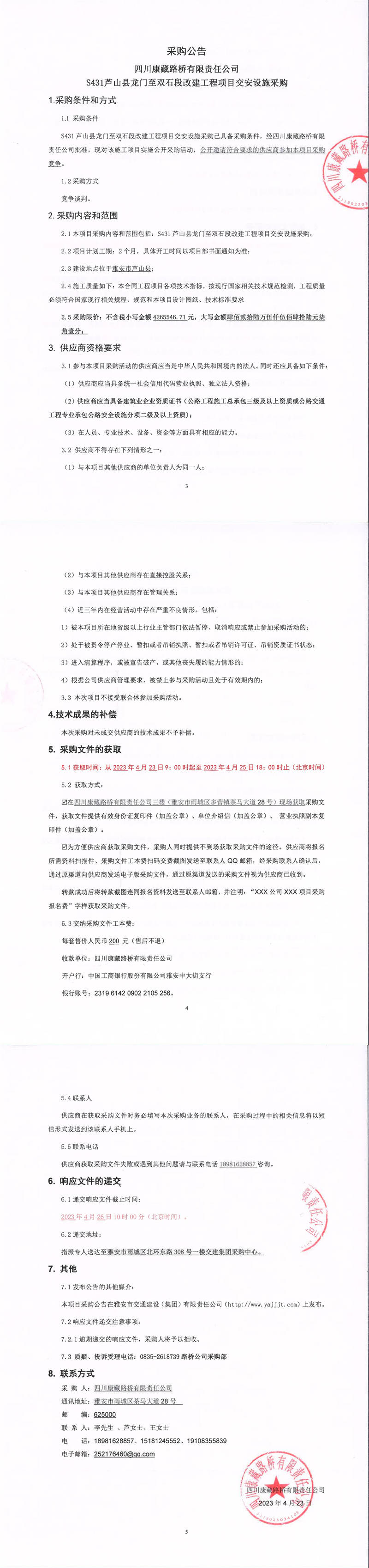 四川康藏路橋有限責(zé)任公司S431蘆山縣龍門至雙石段改建工程項目交安設(shè)施采購