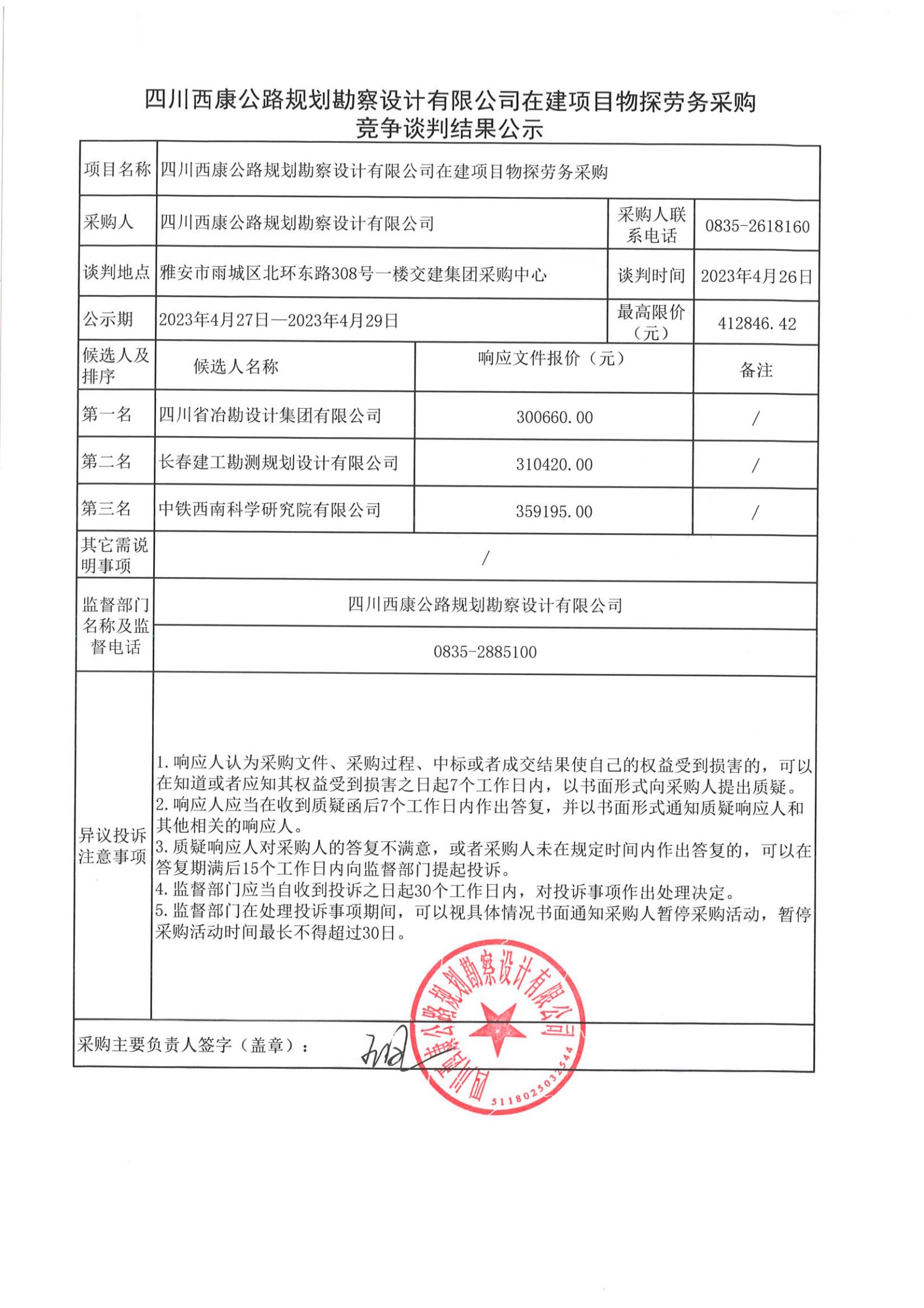 四川西康公路規(guī)劃勘察設(shè)計有限公司在建項(xiàng)目物探勞務(wù)采購競爭談判結(jié)果公示