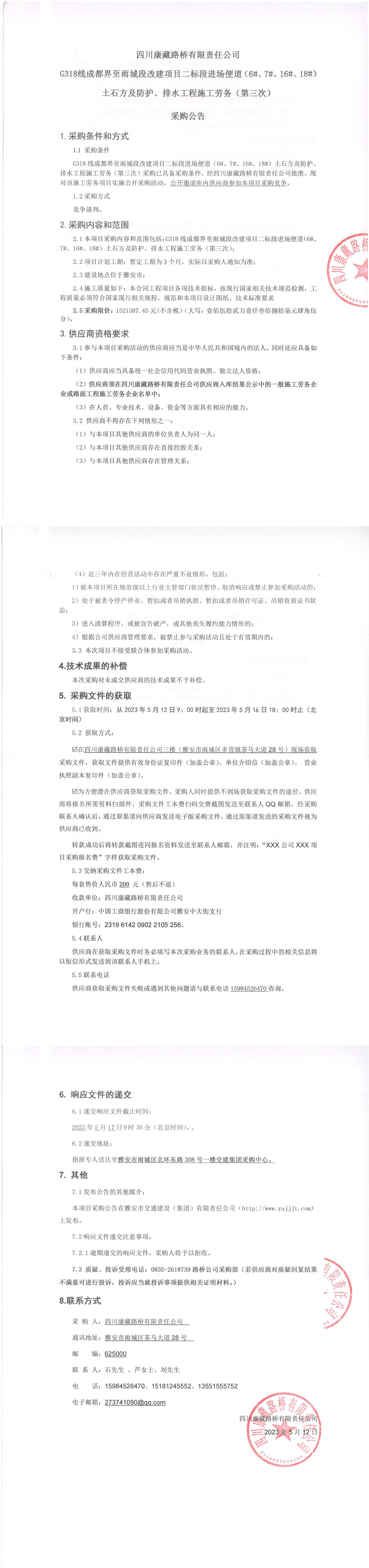 四川康藏路橋有限責(zé)任公司G318線成都至雨城段改建項目二標(biāo)段進(jìn)場便道(6#、7#、16#、18#)土石方及防護(hù)、排水工程施工勞務(wù)(第三次)采購公告