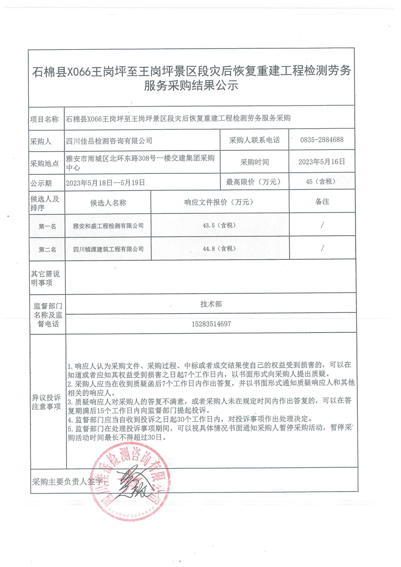 四川佳岳檢測咨詢有限公司石棉縣X066王崗坪至王崗坪景區(qū)段災(zāi)后恢復重建工程檢測勞務(wù)服務(wù)采購結(jié)果公示