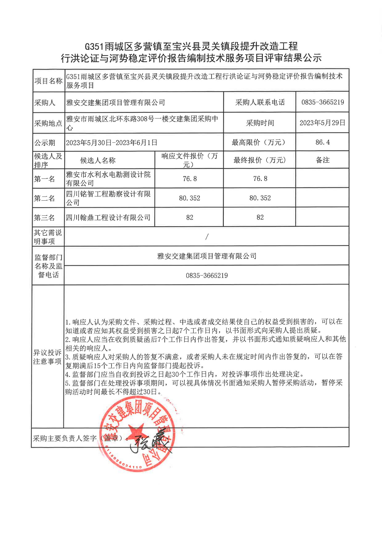 雅安交建集團(tuán)項(xiàng)目管理有限公司G351雨城區(qū)多營鎮(zhèn)至寶興縣靈關(guān)鎮(zhèn)段提升改造工程行洪論證與河勢穩(wěn)定評價報(bào)告編制技術(shù)服務(wù)項(xiàng)目評審結(jié)果公示