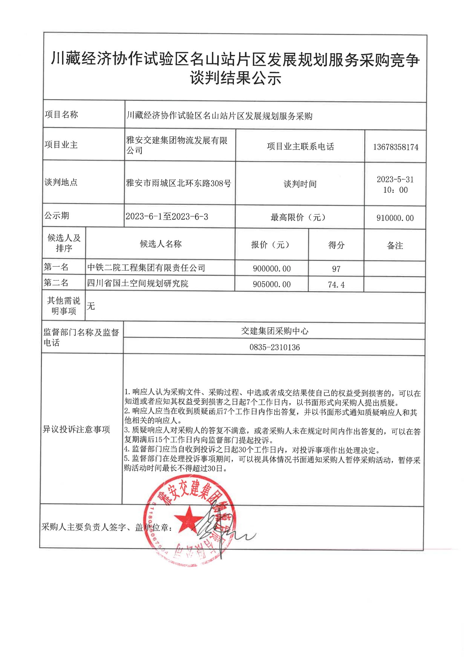 雅安交建集團物流發(fā)展有限公司川藏經濟協作試驗區(qū)名山站片區(qū)發(fā)展規(guī)劃編制服務采購競爭談判結果公示