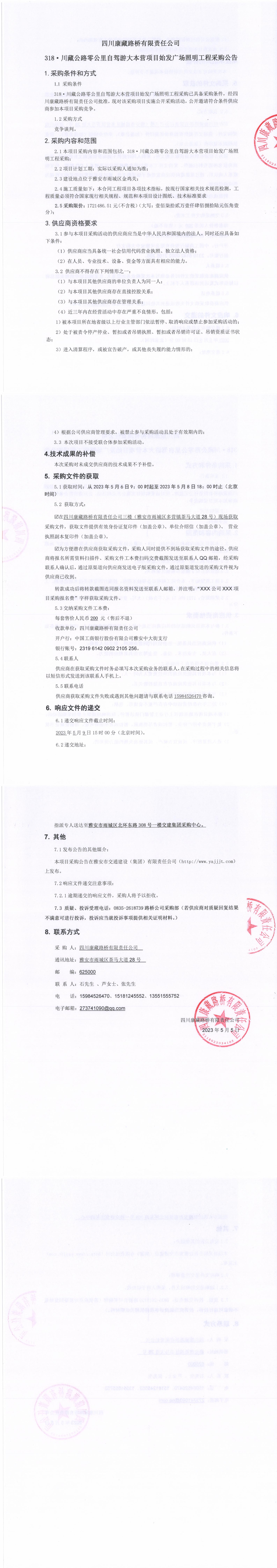 四川康藏路橋有限責任公司318·川藏公路零公里自駕游大本營項目始發(fā)廣場照明工程采購公告