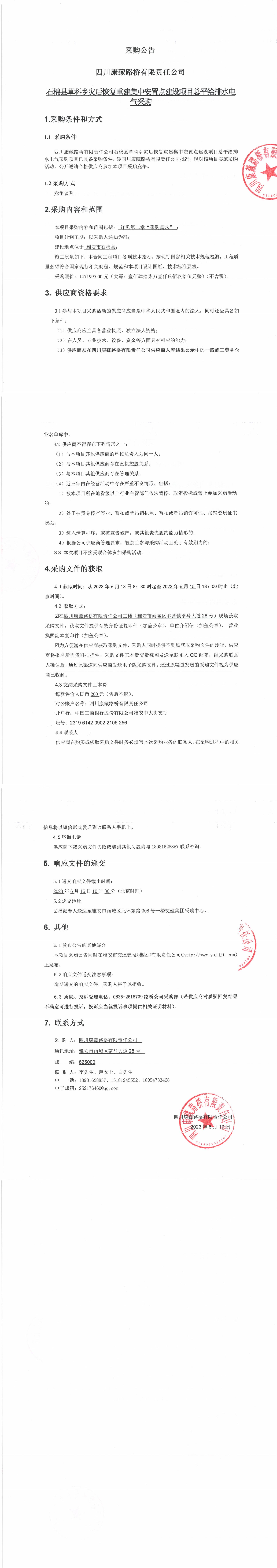 四川康藏路橋有限責(zé)任公司石棉縣草科鄉(xiāng)災(zāi)后恢復(fù)重建集中安置點建設(shè)項目總平給排水電器采購公告