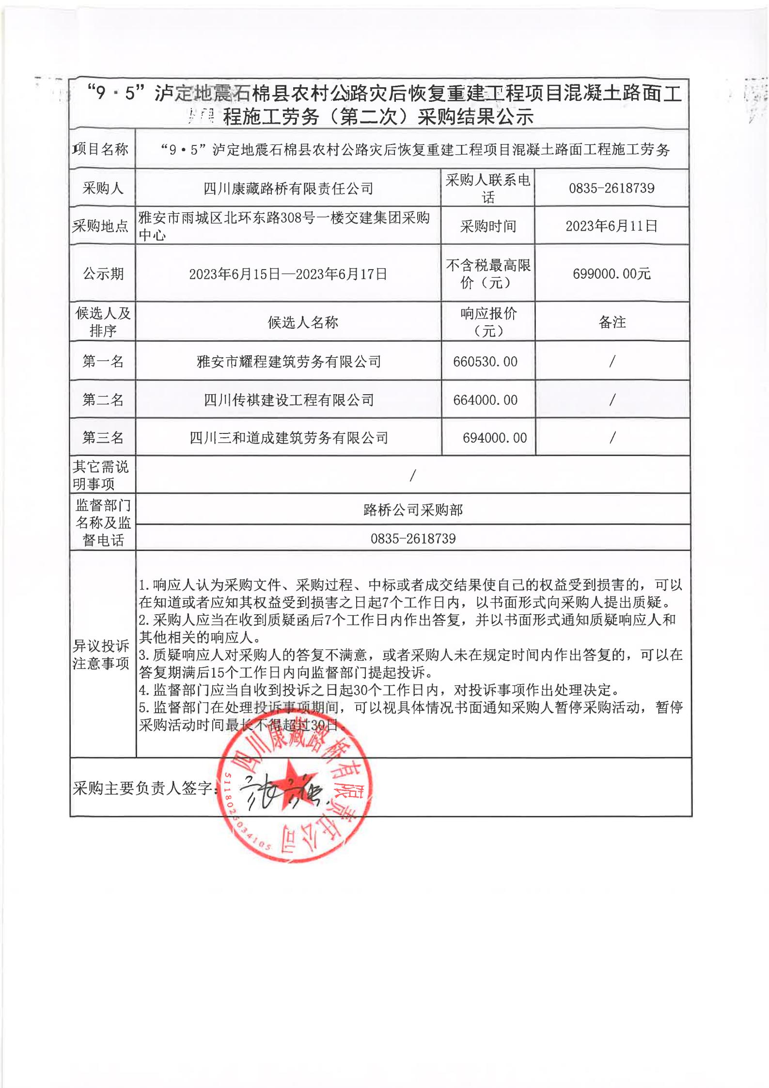 四川康藏路橋有限責任公司“9·5”瀘定地震石棉縣農(nóng)村公路災后恢復重建工程項目混凝土路面工程施工勞務采購(第二次)結果公示
