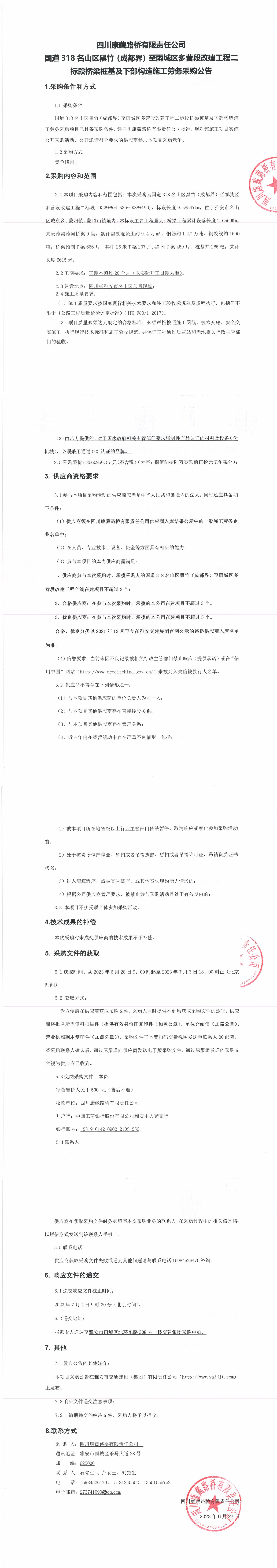 四川康藏路橋有限責任公司國道318名山區(qū)黑竹(成都界)至雨城區(qū)多營段改建工程二標段橋梁樁基及下部構造施工勞務采購公告