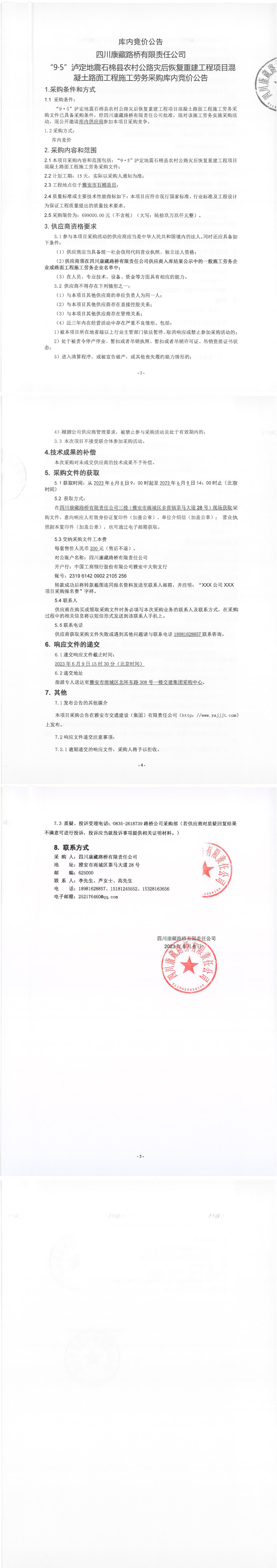 四川康藏路橋有限責(zé)任公司“9·5”瀘定地震石棉縣農(nóng)村公路災(zāi)后恢復(fù)重建工程項(xiàng)目混凝土路面工程施工勞務(wù)采購庫內(nèi)競價(jià)公告