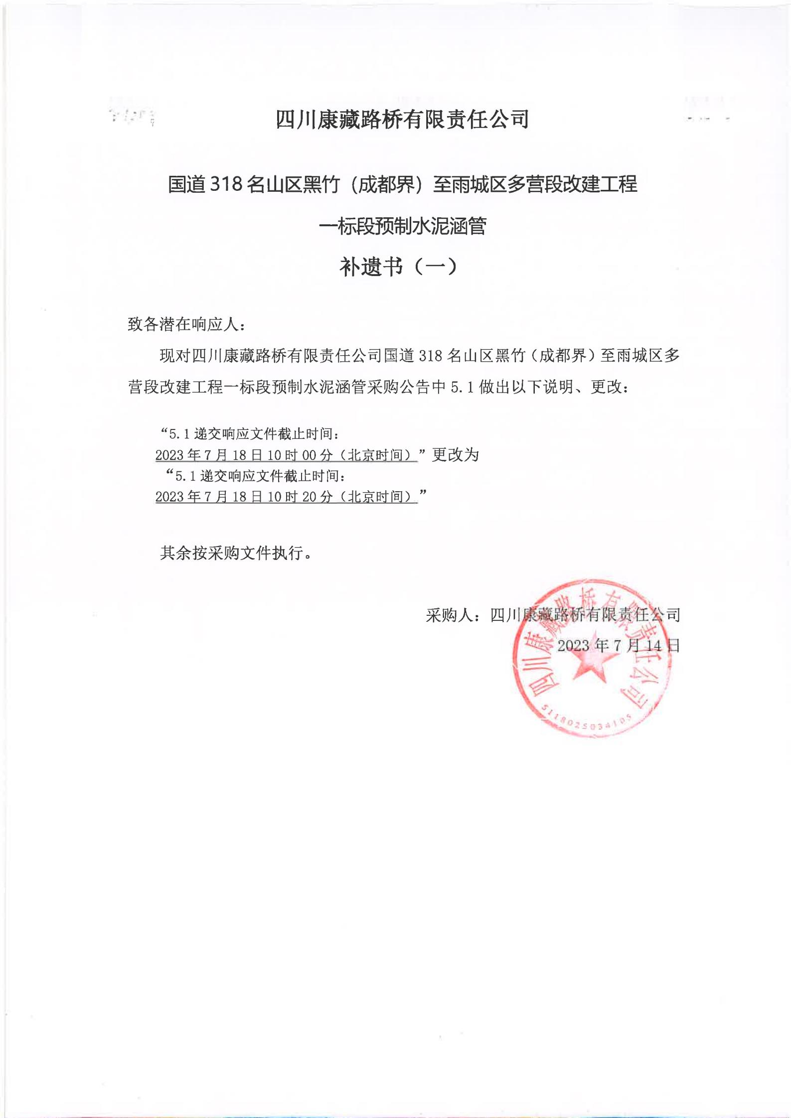 四川康藏路橋有限責(zé)任公司國(guó)道318名山區(qū)黑竹(成都界)至雨城區(qū)多營(yíng)段改建工程一標(biāo)段預(yù)制水泥涵管(補(bǔ)遺書(shū))(一)