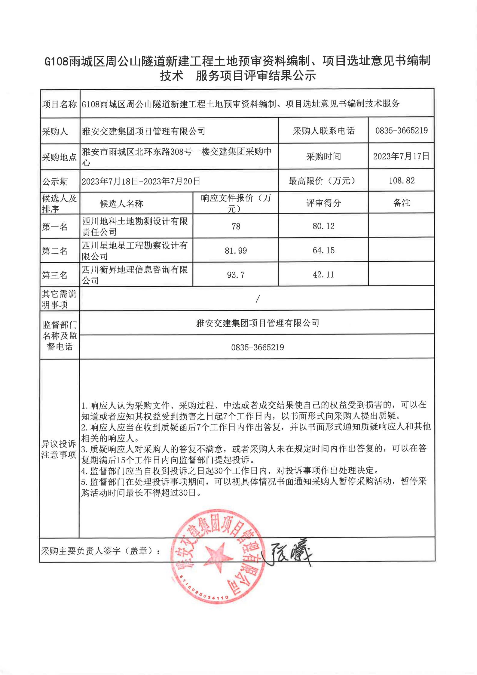 雅安交建集團(tuán)項目管理有限公司G108雨城區(qū)周公山隧道新建工程土地預(yù)審資料編制、項目選址意見書編制技術(shù)服務(wù)項目評審結(jié)果公示