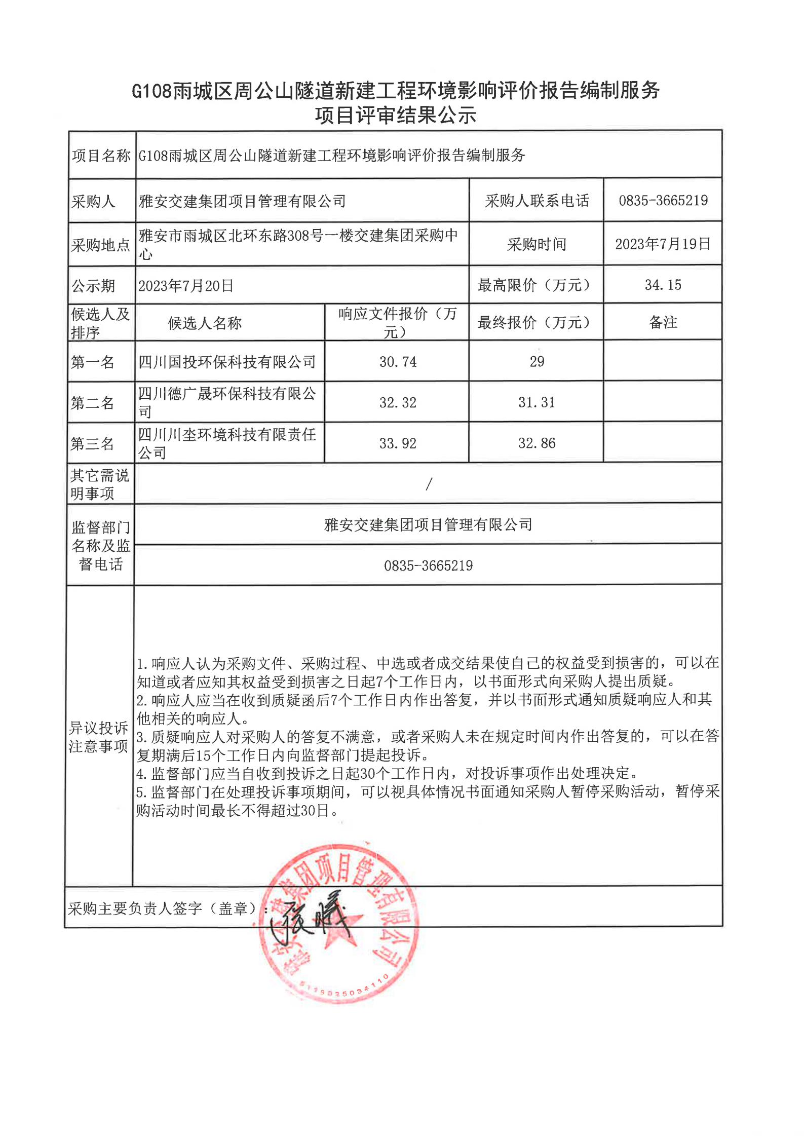 雅安交建集團項目管理有限公司G108雨城區(qū)周公山隧道新建工程環(huán)境影響評價報告編制服務項目評審結果公示