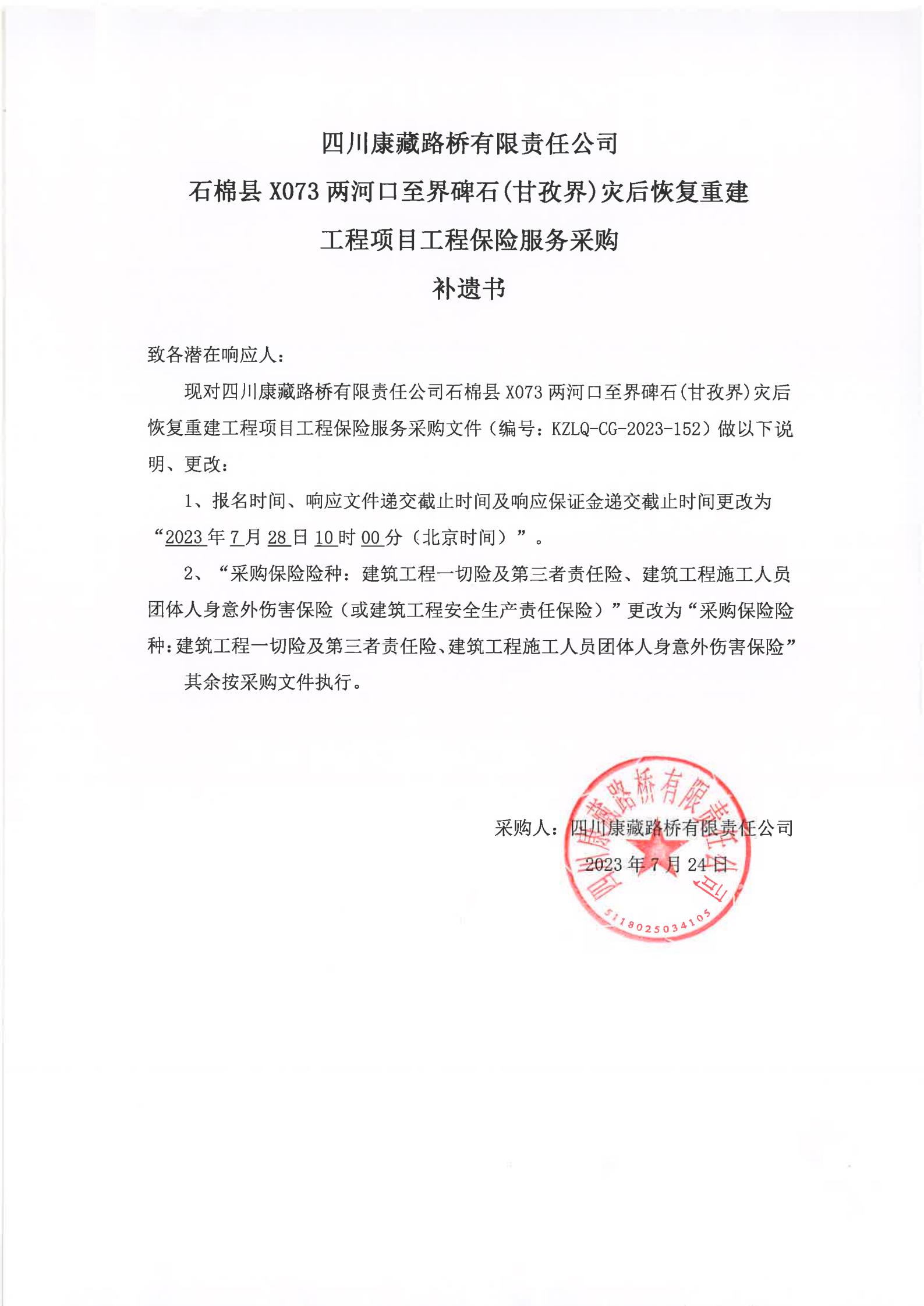 四川康藏路橋有限責任公司石棉縣X073兩河口至界碑石(甘孜界)災(zāi)后恢復重建工程項目工程保險服務(wù)采購補遺書