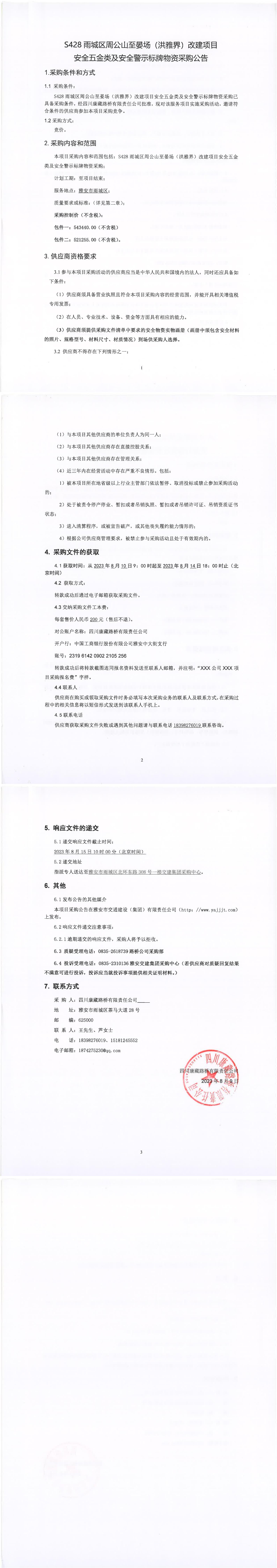 四川康藏路橋有限責任公司S428雨城區(qū)周公山至宴場(洪雅界)改建項目安全五金類及安全警示標牌物資采購公告