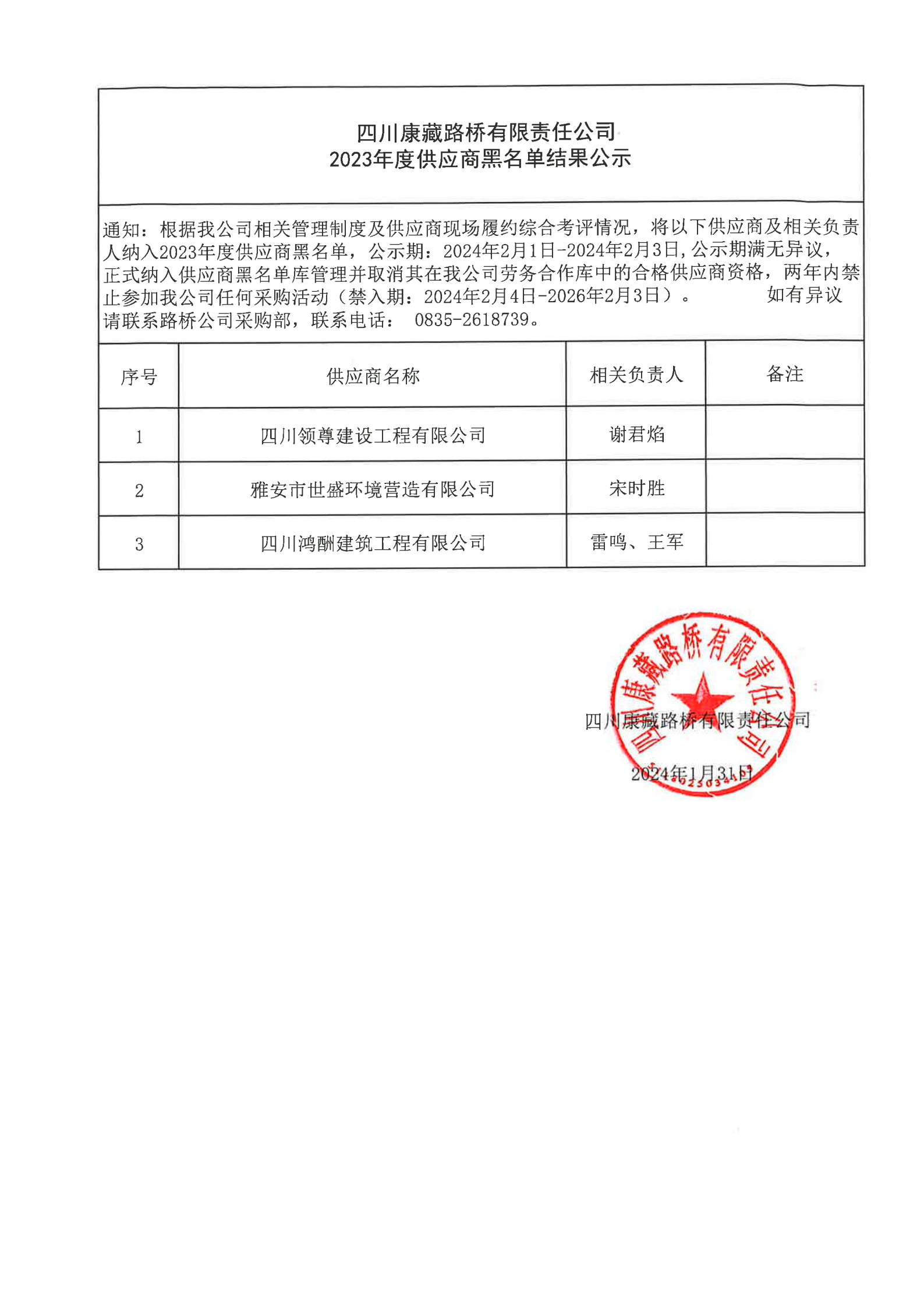 四川康藏路橋有限責任公司2023年度供應商黑名單結果公示