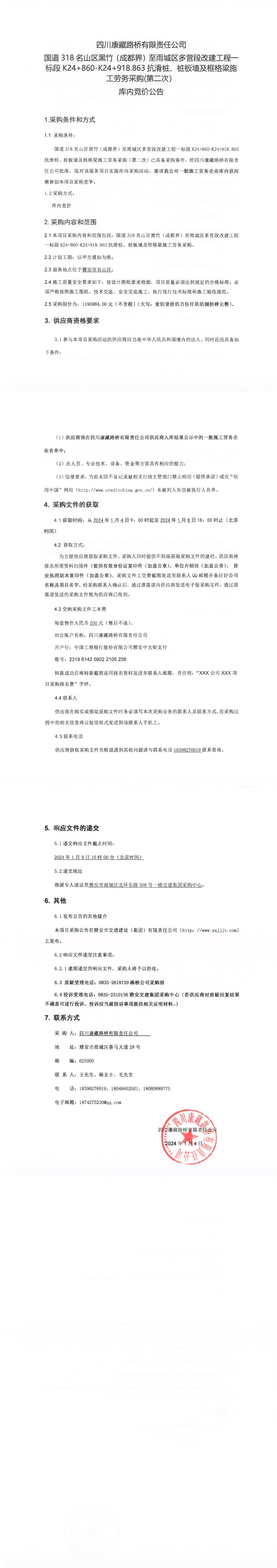 四川康藏路橋有限責(zé)任公司國(guó)道318名山區(qū)黑竹(成都界)至雨城區(qū)多營(yíng)段改建工程一標(biāo)段K24+860-K24+918.863抗滑樁、樁板墻及框格梁施工勞務(wù)采購(gòu)(第二次)庫(kù)內(nèi)競(jìng)價(jià)公告