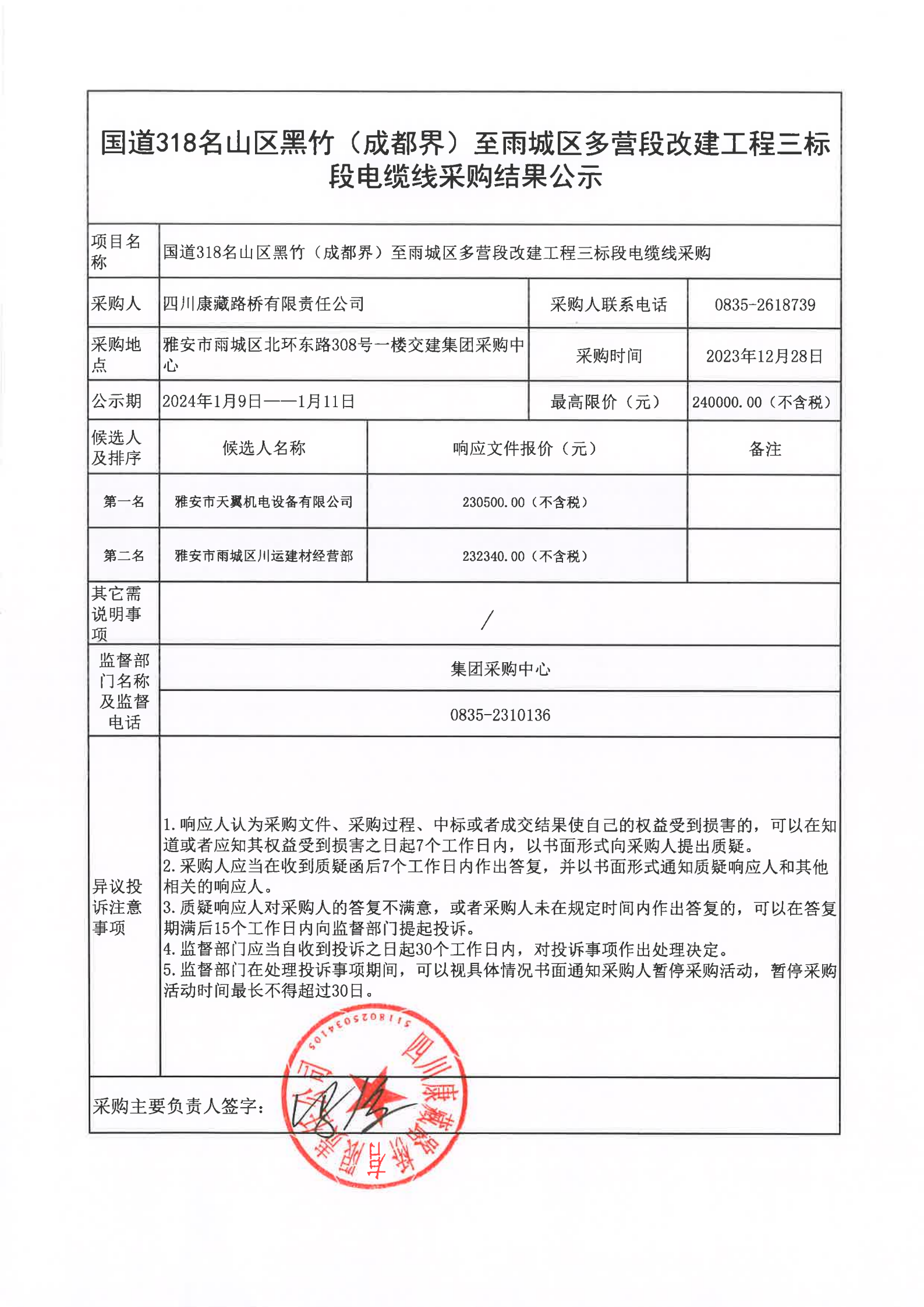 四川康藏路橋有限責任公司國道318名山區(qū)黑竹(成都界)至雨城區(qū)多營段改建工程三標段電纜線采購結(jié)果公示