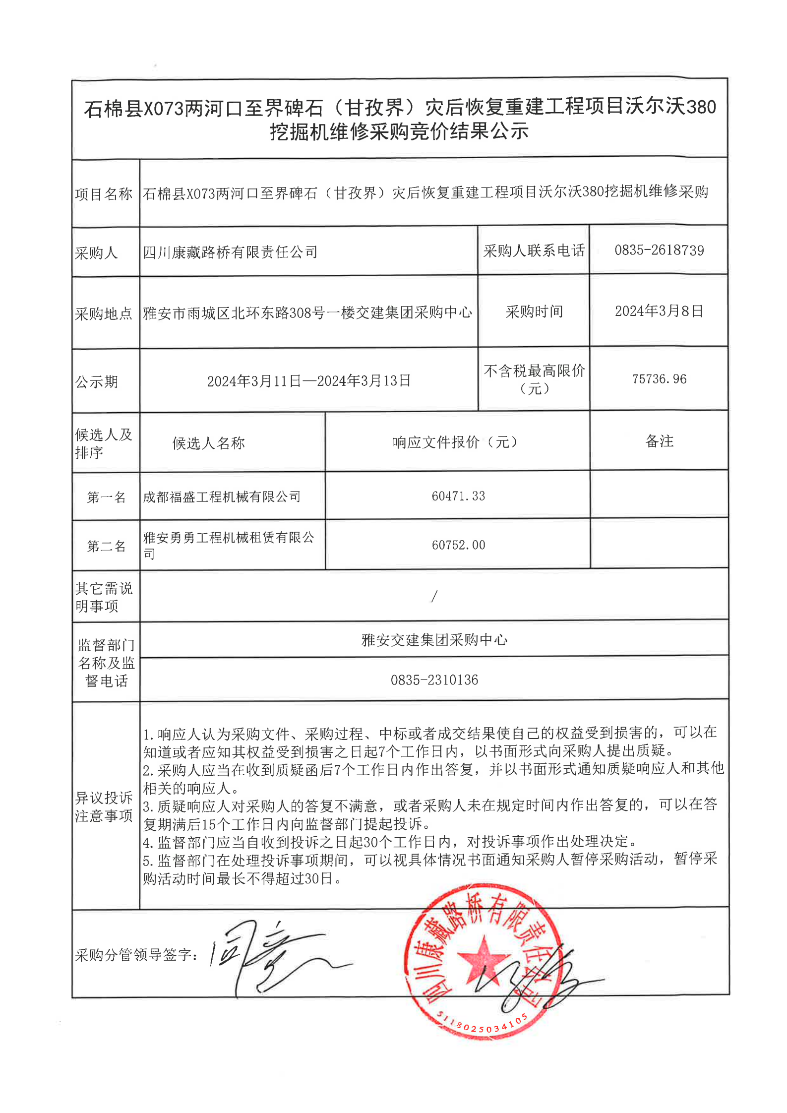 四川康藏路橋有限責(zé)任公司石棉縣X073兩河口至界碑石(甘孜界)災(zāi)后恢復(fù)重建工程項目沃爾沃380挖掘機(jī)維修采購競價結(jié)果公示
