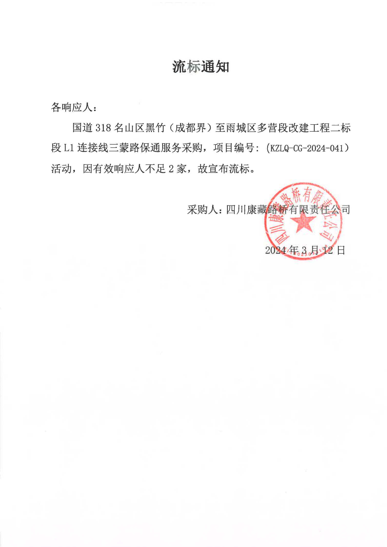 四川康藏路橋有限責(zé)任公司國道318名山區(qū)黑竹(成都界)至雨城區(qū)多營段改建工程二標(biāo)段L1連接線三蒙路保通服務(wù)采購流標(biāo)通知