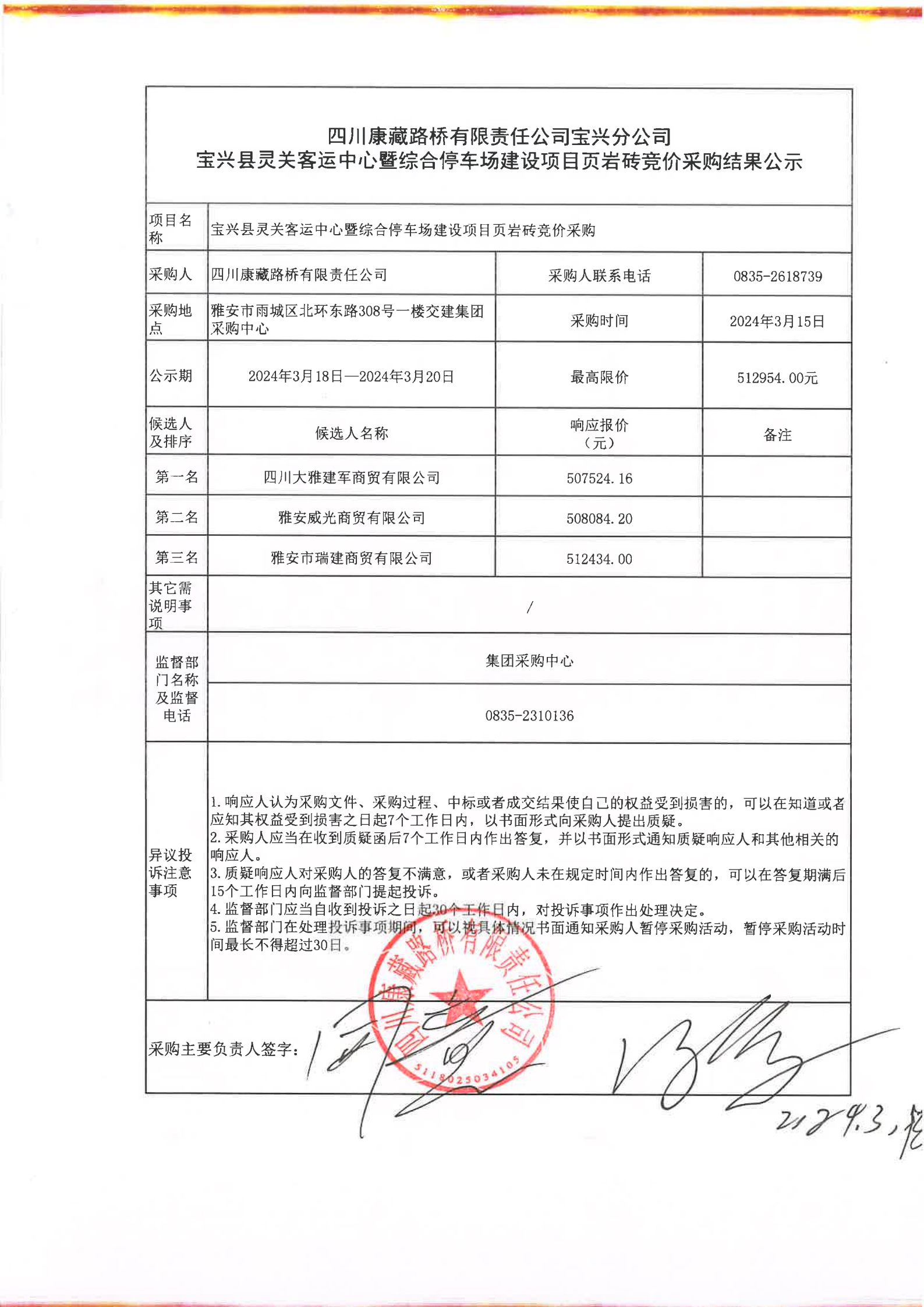 四川康藏路橋有限責任公司寶興分公司寶興縣靈關客運中心暨綜合停車場建設項目頁巖磚競價采購結果公示