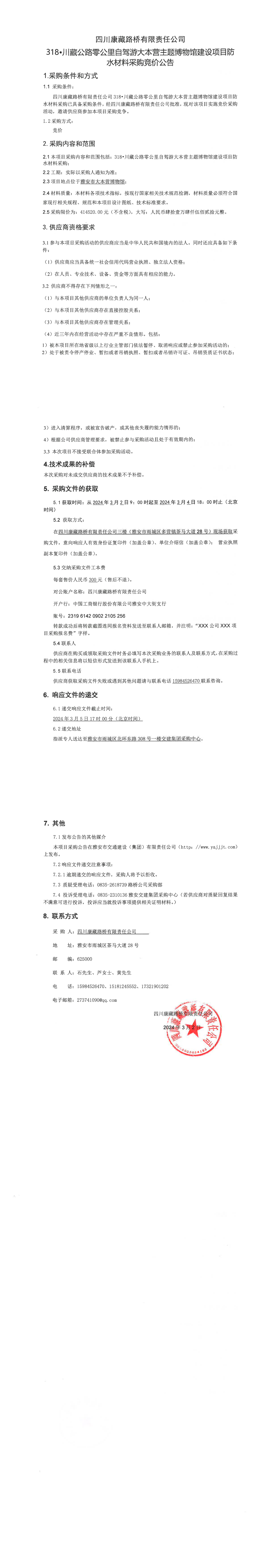 四川康藏路橋有限責任公司318·川藏公路零公里自駕游大本營主題博物館建設(shè)項目防水材料采購競價公告