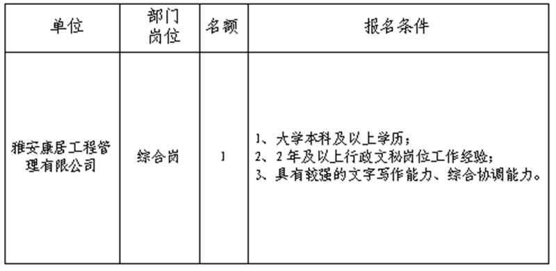 根據(jù)發(fā)展需要,決定面向社會(huì)公開(kāi)招聘雅安市交通建設(shè)(集團(tuán))有限責(zé)任公司(以下簡(jiǎn)稱“雅安交建集團(tuán)”)所屬子公司工作人員1名,現(xiàn)將有關(guān)事項(xiàng)公告如下: