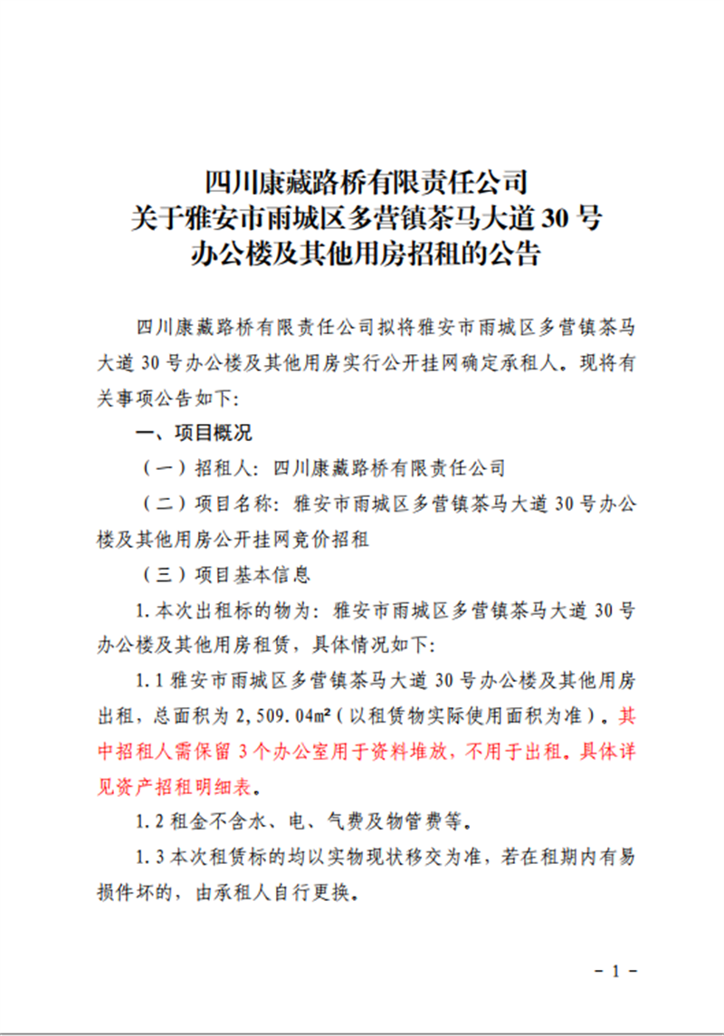 關(guān)于雅安市雨城區(qū)多營鎮(zhèn)茶馬大道30號辦公樓及其他用房招租的公告