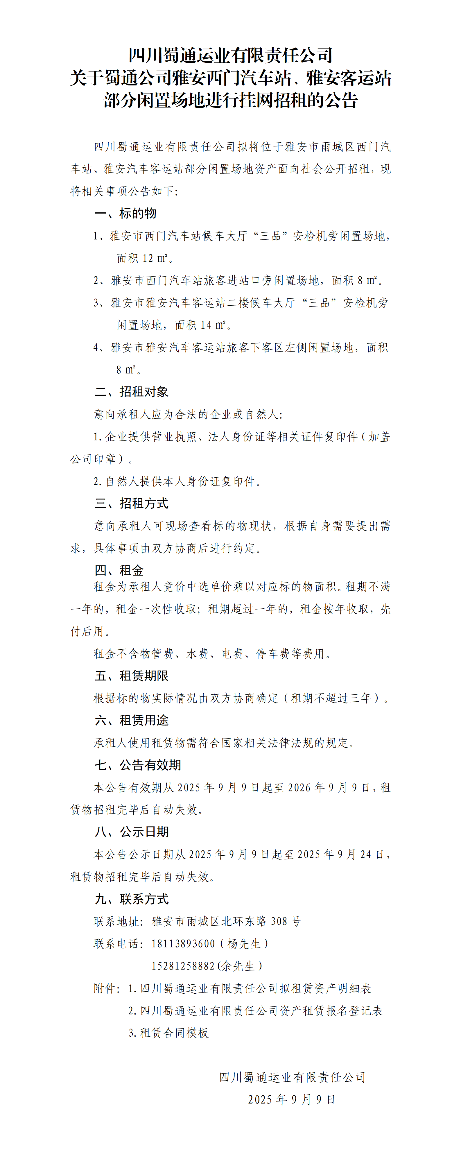 四川蜀通運業(yè)有限責任公司 關(guān)于蜀通公司雅安西門汽車站、雅安客運站部分閑置場地進行掛網(wǎng)招租的公告