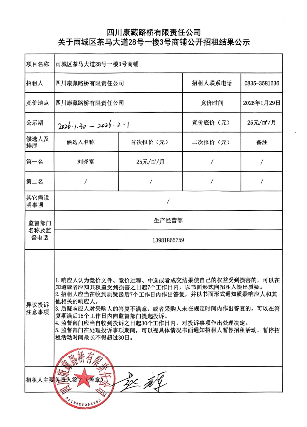 四川康藏路橋有限責(zé)任公司關(guān)于雨城區(qū)茶馬大道28號(hào)一樓3號(hào)商鋪公開(kāi)招租結(jié)果公示
