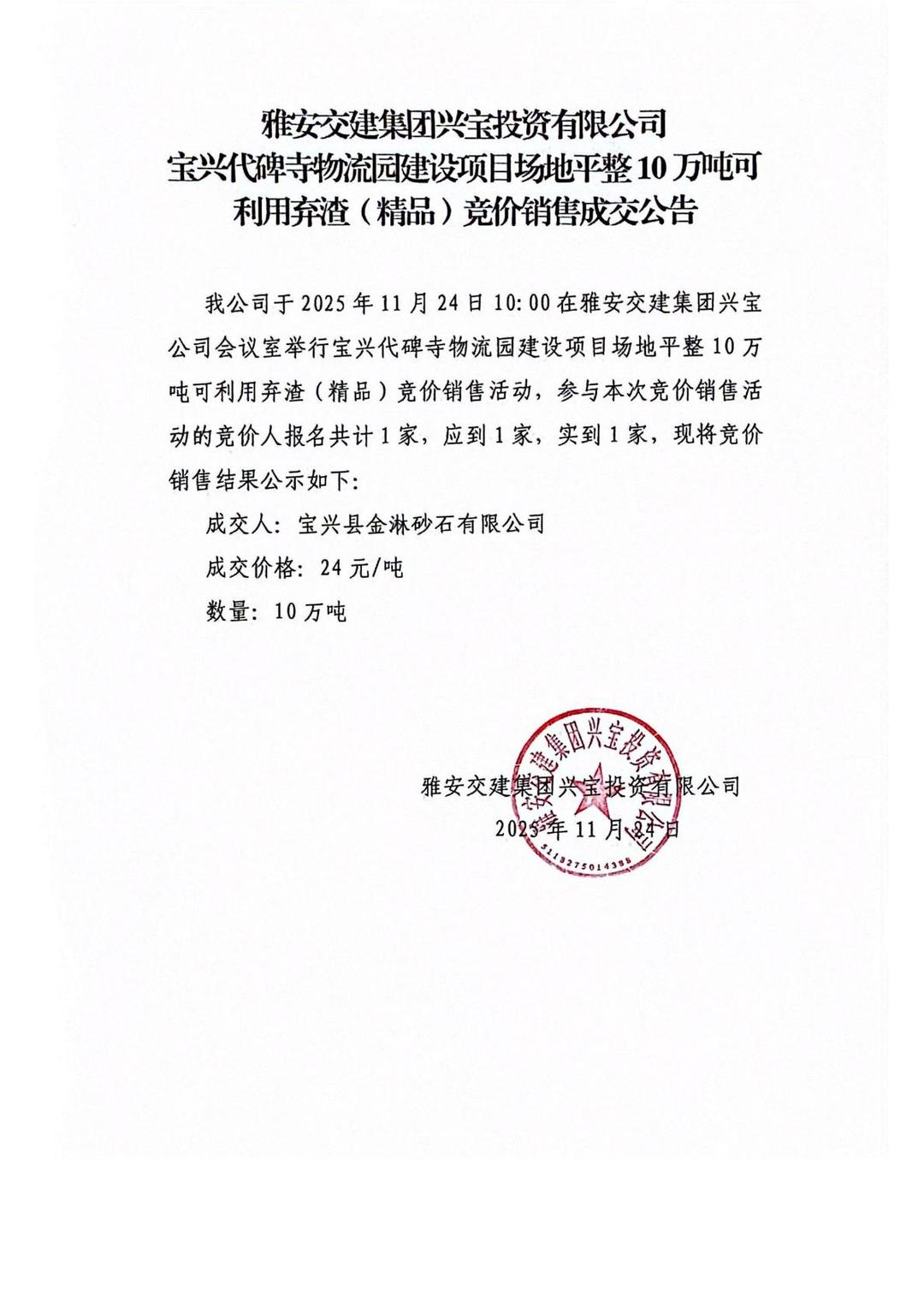 雅安交建集團(tuán)興寶投資有限公司10萬噸可利用棄渣(精品)競價(jià)銷售成交公告(2025.11.24)